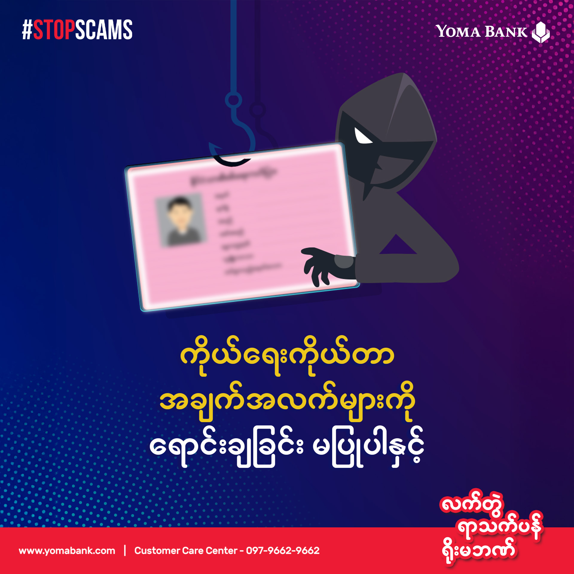 မသမာသူတွေထံကို မိမိငွေကြေးနဲ့ကိုယ်ရေးအချက်အလက်တွေ ဆုံးရှုံးမှုမရှိစေဖို့ Scam Awareness ဆိုင်ရာ အသိပညာဗဟုသုတတွေကို မျှဝေပေးသွားမှာဖြစ်လို့ Yoma Bank Facebook Page ကိုစောင့်ကြည့်ပေးပါ။ မည်သည့်အချိန်တွင်မဆို သံသယဖြစ်ဖွယ်အခြေအနေများနှင့် ကြုံတွေ့ရပါက ရိုးမဘဏ်၏ Customer Care Center ၉၆၆၂ (သို့မဟုတ်) ၀၉၇၉၆၆၂၉၆၆၂ သို့ ချက်ချင်းဆက်သွယ်ပါ။