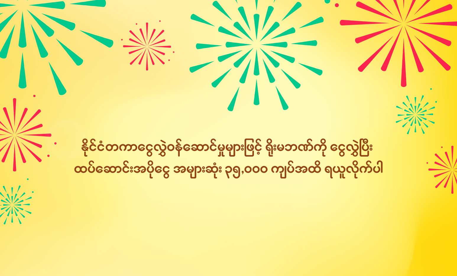 - ဤအစီအစဥ်တွင် ပေးအပ်မည့် ထပ်ဆောင်းအပိုငွေသည် အစီအစဉ်ကာလအတွင်း ပြီးမြောက်သွားသော ငွေလွှဲ Transaction တစ်ကြောင်းချင်းစီအတွက်သာ တွက်ချက်သွားမည်ဖြစ်ပါသည်။